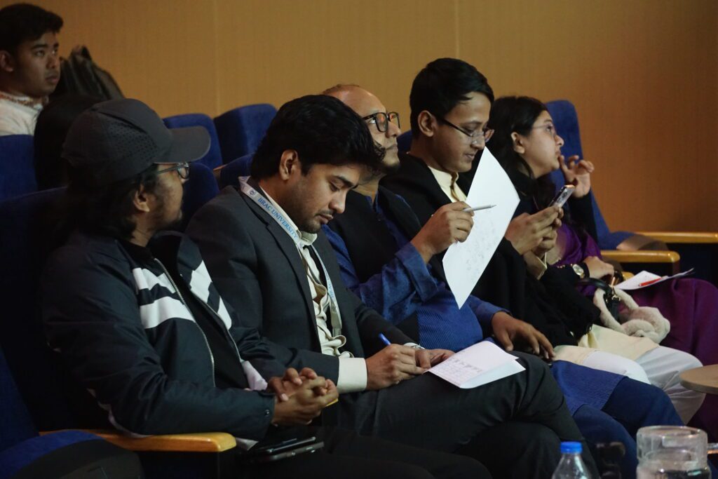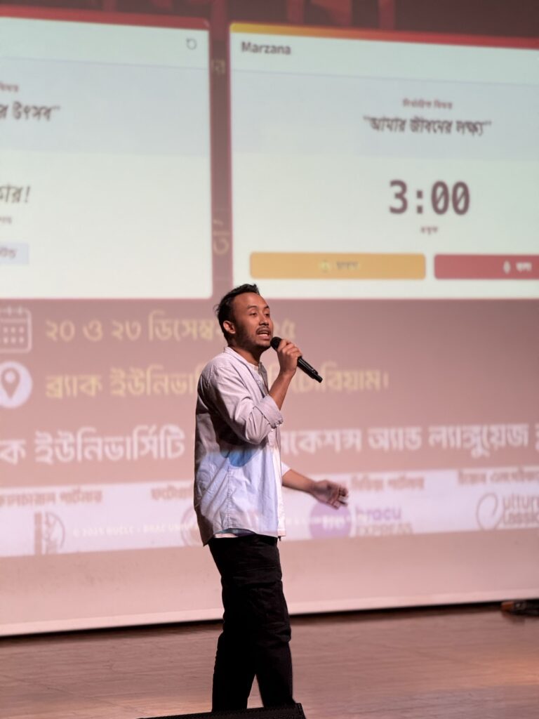 Then on the 30th, poem recitation and final round of আমার ভাষা owned the stage. Following that, Dr. David Dowland (Registrar, BracU) expressed how every district has their own uniqueness and long heritage. Mohammad Ashaduzzaman (Professor, Dhaka University), shared that the diversity of our language has its beauty and how ‘প্রমিত বাংলা’ is the result of change in language through time. Afterwards, renowned writer Sadat Hossain emerged to the stage and shared his advice on writing. He shared, “It is not only from books that we can read but also from our surroundings.” Emran Mahfuz, (Writer, Daily Star, Bangla) started his speech by observing 30 seconds of silence in remembrance of the July uprising and shared the importance of Bangla. Shaila Sultana (Professor, BIL) said, “This program has been a great celebration of languages, to keep all the indigenous languages alive.”