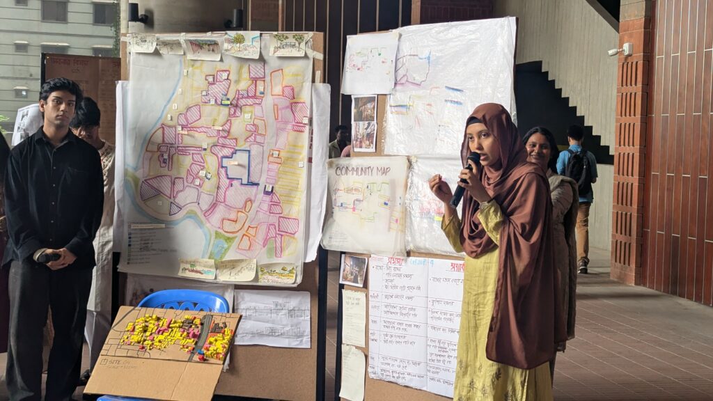 Although this conversion has contributed to the area’s economic growth, with increased student accommodation, cafes, and global food chains, it has also created disruptions, particularly severe traffic congestion and reduced privacy for residents. In this event, the students discussed the current state of Merul Badda and showcased models designed to address these issues. They focused on integrating commercial and residential infrastructure while highlighting the economic growth of this sector.